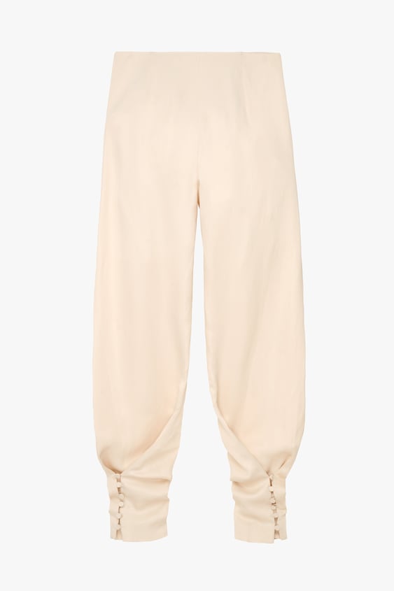 El diseño de este pantalón también recuerda mucho a la moda de otros siglos, aunque al mismo tiempo tiene un corte actual. Es un pantalón de tiro medio con pinzas en la parte delantera y un cierre frontal con cremallera, botón y gancho metálico. Tiene bolsillos laterales y unos bajos muy llamativos ajustados al tobillo con un puño ancho con cierre de botones forrados en el mismo tejido. Sin duda es una prenda ideal para ocasiones especiales. Es de color melocotón y está hecho en viscosa y lino. Puedes llevártelo a casa por 89,95 euros.