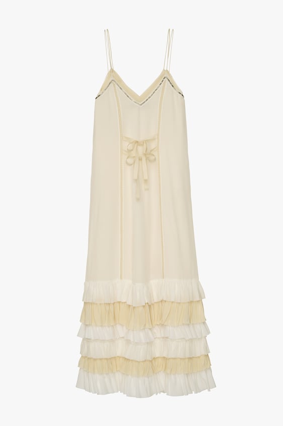 Este vestido lencero está inspirado en las enaguas que vestían antiguamente las mujeres por debajo de la ropa de calle. También recuerda mucho a los vestidos alegres de los años 20. Es de corte largo, con un escote de pico y tirantes finos dobles. El bajo tiene un acabado de volantes de diferentes tonos, y cuenta con detalles decorativos de puntillas a tono, abalorios metálicos y varias lazadas en la espalda. Está confeccionado en un tejido suave y fluido de viscosa en tonos crema y blanco roto. Lo tienes en Zara pro 129 euros y es una edición limitada.