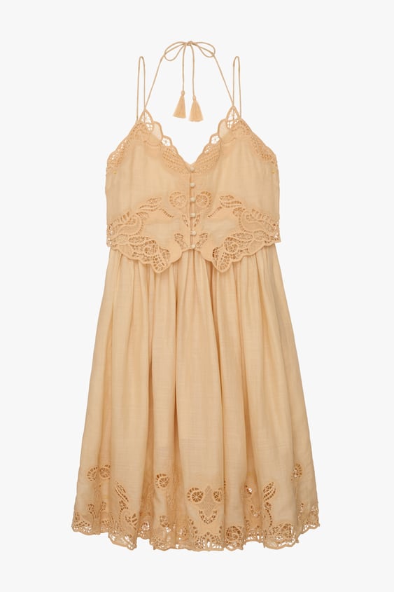 Este bonito vestido destaca por lo cuidado de todos sus detalles. Es corto y ligero, perfecto para el verano, con un escote de pico y tirantes finos que se pueden ajustar con lazada y un tercer tirante para atar en la nuca con detalle de borla. La parte de arriba es un corpiño con pequeños botones decorativos en la parte de delante. La falda tiene un poco de vuelo y lleva bolsillos laterales ocultos en la costura. La prenda está decorada con preciosos bordados perforados. Es de color melocotón y está hecho con 100% ramio, una fibra vegetal que se extrae de la ortiga blanca. Puedes llevártelo en Zara por 149 euros.