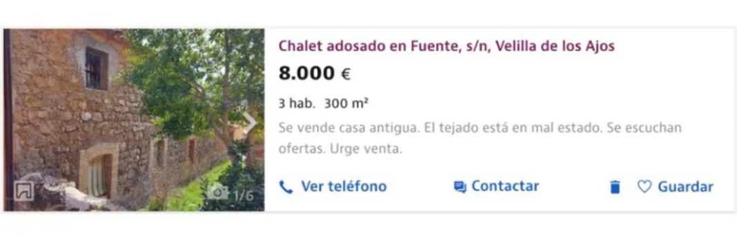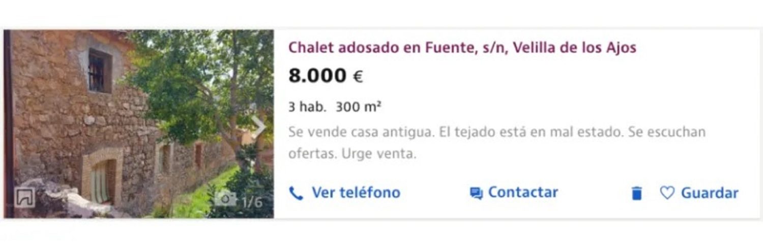 Este chalet adosado en Velilla de los Ajos está tirado de precio. Te lo llevas por 8.000 euros, ¡más barato que un coche! Cuenta con 300 metros cuadrados y 2 plantas divididas en 3 habitaciones, baño, cocina y salón comedor. Se trata de una casa antigua que tiene imperfecciones en el tejado. Su nuevo propietario o propietaria tendrá que hacerle una reforma sí o sí. A su alrededor tiene una zona de jardín y un patio adosado con árboles frutales. Después de un lavado de cara puede convertirse en la casa perfecto.
