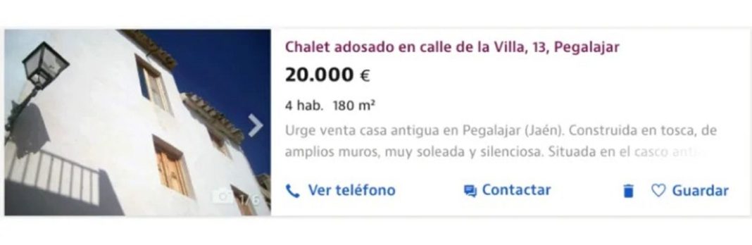 Entre los chalets que recoge la web, hay otro en Pegalajar, Jaén, que tiene un valor de 20.000 euros. Está a medio reformar, por lo que aquel o aquella que desee comprarlo debe tener en cuenta que tiene que hacerle varios arreglos. Se trata de una construcción en tosca, con amplios muros y ubicada en el barrio árabe. Posee una superficie habitable de 180 metros cuadrados distribuidos en 4 habitaciones, 3 baños, salón comedor y cocina. Los propietarios alertan que todavía no tiene instalación eléctrica ni fontanería, por lo que no cuenta con cédula de habitabilidad ni certificación energética.