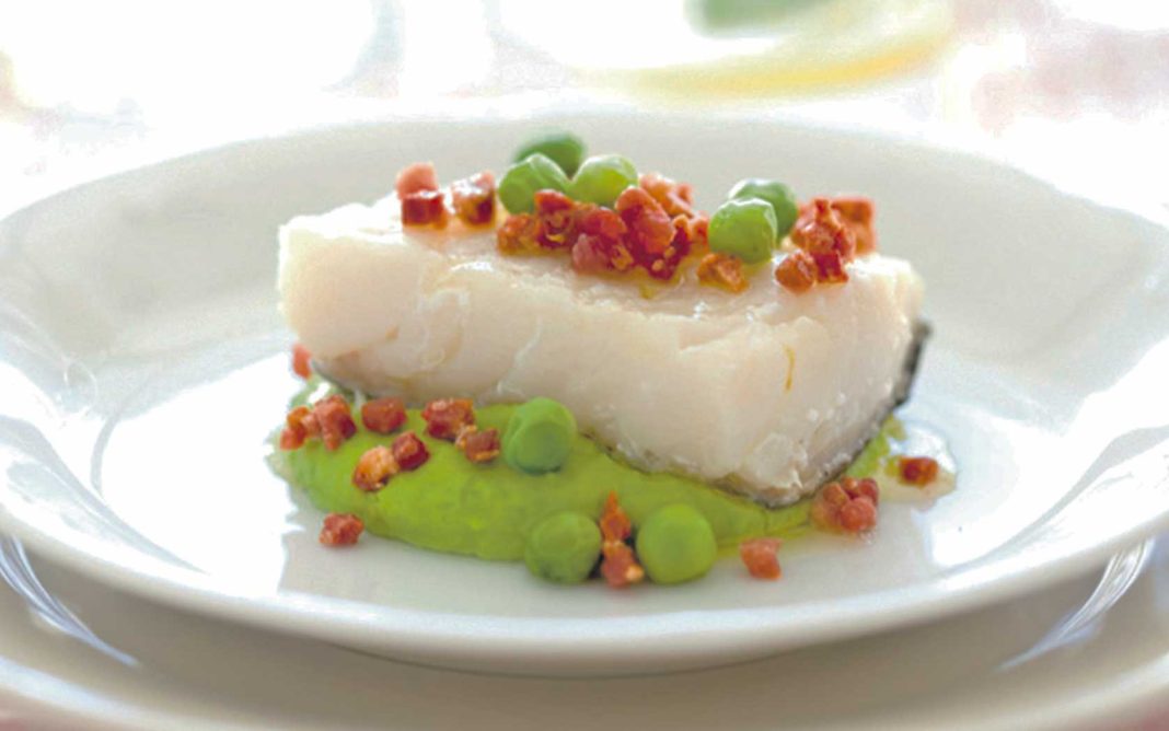 Ya tenemos la parte más importante de nuestra receta de bacalao. Cuando la salsa esté casi espesa, volvemos a voltear los lomos de bacalao, es decir, dejamos de nuevo la piel hacia arriba. Después añadimos los guisantes y el zumo de limón y seguimos moviendo en círculos la cazuela de forma constante. En un par de minutos los guisantes se habrán cocinado y la salsa habrá terminado de espesar. Cuando el pilpil esté completamente ligado, espolvoreamos todo el plato con un poco de ralladura de limón. Se sirve recién hecho.