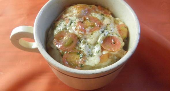 Lo primero es elegir una taza adecuada, con una boca más bien ancha para hacer la mezcla más fácilmente. Primero echamos los ingredientes secos (harina, levadura y sal), y los mezclamos bien con ayuda de un tenedor para que todo quede perfectamente integrado. Seguidamente, agregamos el aceite y la leche y volvemos a mezclar con esmero para conseguir una mezcla homogénea y sin grumos que será la masa de nuestra pizza rápida. Tiene que quedar una masa con una consistencia parecida a la que obtendríamos si hiciésemos la mezcla a mano.