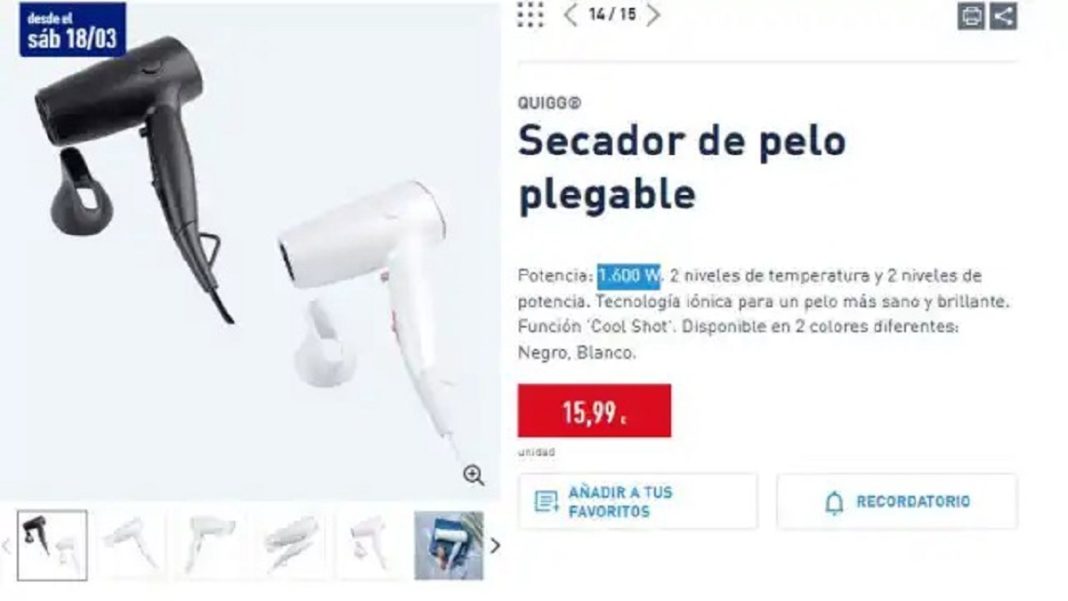 Algunas personas caen en el error de pensar que en el hotel al que van a ir de vacaciones habrá secador y se lo dejan en casa. Después ven las fotografías de su tiempo libre con el pelo cargado de frizz o cogen resfriados. Aldi cambia esto con el lanzamiento de este exclusivo secador de pelo plegable que es una maravilla. No notarás la diferencia con los que utilizan los estilistas cuando vas a la pelu. Posee una potencia de 1.600W y una función “Cool Shot”. Vale 15,99 euros. Aunque este producto es uno de los más buscados dentro de la firma, también hay otros que te harán caerte de espaldas.