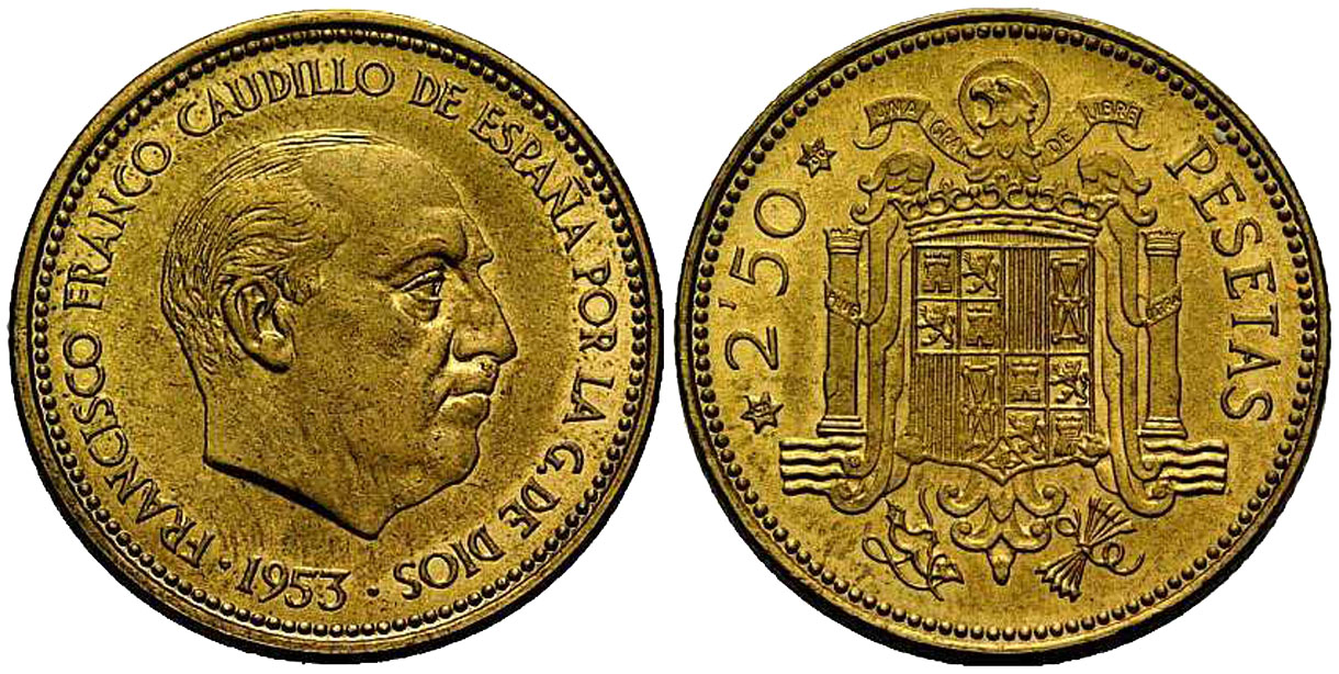 En este caso, hablamos de una de las monedas más difíciles de encontrar. Se trata de un ejemplar 2,5 pesetas. En 1953 no se pusieron demasiadas en circulación y, muy poco después, se dejaron de utilizar. Esto hace que, en las subastas online, puedas llegar a conseguir por uno de estos ejemplares más de 17.000 euros. Sin duda, es otra opción a tener en cuenta.