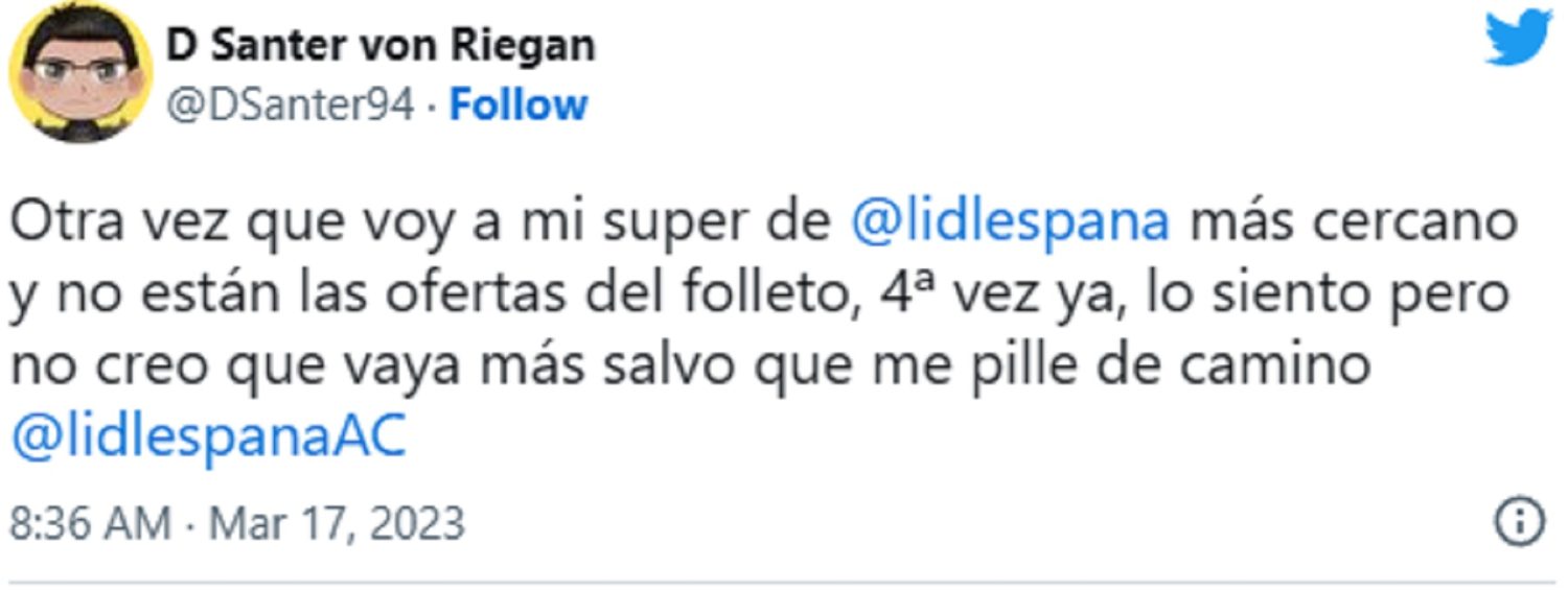 Miles de clientes encuentran en estas ofertas una gran oportunidad de ahorrar en sus compras. El cliente afecto se tiró a una de sus ofertas y terminó lamentándolo en el ámbito social. Se dirigió al establecimiento públicamente y soltó: “Otra vez que voy a mi súper más cercano y no están las, cuarta vez ya”. Los administradores de las redes sociales nuevamente pedían disculpas al usuario por la situación. Asimismo, solicitaba al internauta que le aportara información sobre el lugar al que había acudido.
