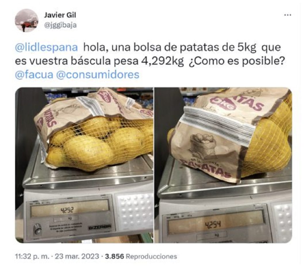 Pero la queja del cliente de Lidl no tenía que ver con la calidad del producto si no con el hecho de que se marcaba en una bolsa de patatas que era de 5 kilos cuando la puso en la báscula y marcaba 4,292 kilos. “¿Cómo es posible?”, plantó ante la comunidad de Twitter. El presunto engaño de las patatas dejó flipando a los internautas que lo exteriorizaron. Esto sucedió en una tienda de Torrelodones, según contó el internauta en la red social. “¿Casi un kilo menos? ¿Cuánto tiempo llevaban las patatas envasadas?”, cuestionaron algunos usuarios.