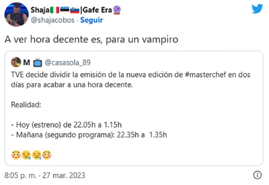 “MasterChef” regresó el lunes pasado a la pantalla de TVE. El programa de “Shine Iberia” ya va por su edición número 11. Para no caer en la monotonía, este año viene cargado de novedades, entre las que destaca que el programa tendrá 2 días de emisión y el doble de aspirantes (30). Lo que parecía una gran idea para sus directivos está resultando una pésima noticia para los seguidores del ‘talent’ gastronómico que no han dudado en cargar contra el proyecto a través de redes sociales. Tras la difusión de la primera entrega, los comentarios que se leen en Twitter no son para nada alentadores.