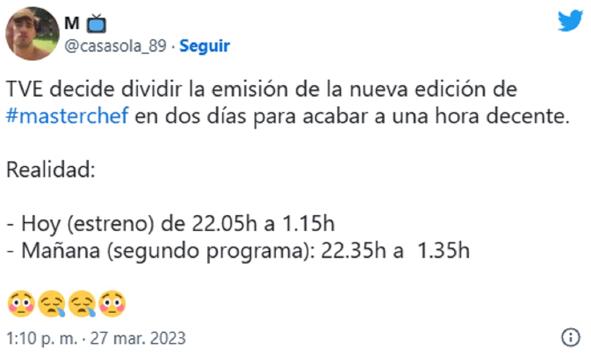 Otra de las quejas viene de la mano con que la emisión ahora es 2 días a la semana. “TVE decide dividir la emisión de la nueva edición de ‘MasterChef’ en 2 días para acabar a una hora decente. Realidad: – Hoy (estreno) de 22.05h a 1.15h – Mañana (segundo programa): 22.35h a 1.35h”, sentenció uno de los usuarios. “A ver, hora decente es, para un vampiro”, soltó otro internauta. “Lo que es una vergüenza es que un programa así tenga que durar tanto y terminar a la 1.00 de la madrugada”, critican. “¿El objetivo de hacer dos programas no era para que dure menos? Pregunto”, plantearon.