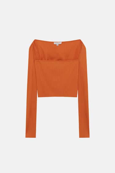 Otro top original que no puede faltar en tu armario es esta bonita pieza con un escote bandeau muy original y perfecto para la primavera. Las mangas tienen también un toque especial porque están diseñadas de forma que parecen manguitos. Es top está hecho en tejido elástico para un ajuste perfecto. Además, es de un llamativo color naranja para darle alegría y energía a tus outfits. Con la rebaja del 50% de Pull & Bear puedes conseguirlo por tan solo 9,99 euros.