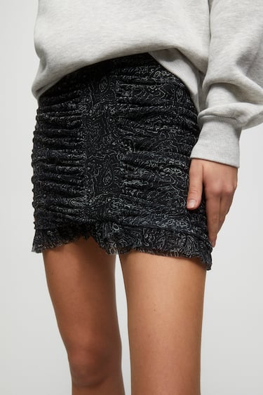 Para las noches de fiesta, Pull & Bear nos propone esta minifalda ajustable, con cintura elástica y un bonito bajo asimétrico. Está cubierta con tejido de tul y lleva detalles de fruncidos que le dan un toque de sofisticación a la prenda. Es de color negro con estampado paisley a contraste, y la puedes incluir en tu guardarropa por 12,59 euros.