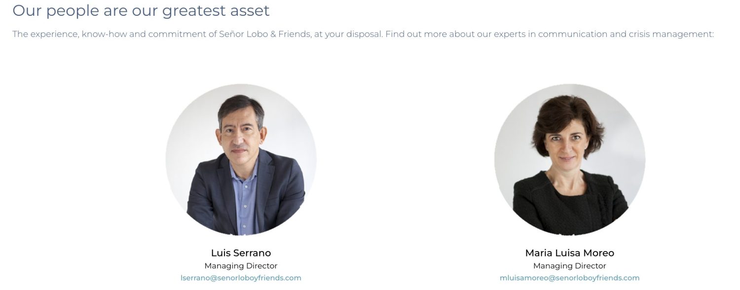 Todo lo aprendió en Llorente & Cuenca, donde estuvo una media de cuatro años. Cuando salió de ahí en 2019, entendió que era el momento de montar una empresa por su cuenta y riesgo llamada Señor Lobo & Friends. Esta consultora tiene a más trabajadores que en la guerra, según se puede apreciar en su plantilla, aunque luego de fondo probablemente muchos de ellos no estén literalmente a jornada completa. Vamos, igual que el propio director, que tiene horario de funcionario de día y luego tiene tiempo para gestionar esa copia de la gestión de crisis de Llorente & Cuenca.