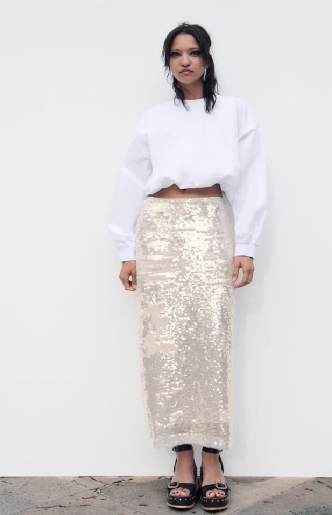 Aunque estamos en la sección de vestidos, no podemos dejar de mencionar esta exquisita falda de lentejuelas que, combinada debidamente, puede superar la elegancia de cualquier vestido de la marca o cualquier otra. Si tienes una fiesta o evento importante en el que quieres resaltar, esta falta de lentejuelas tiene que ser para ti. Esta falda midi de tiro alto con detalle de aplicación de lentejuelas tiene, además, un forro interior combinado a tono. Posee un cierre con cremallera oculta con costura. Vale 39,95 euros.