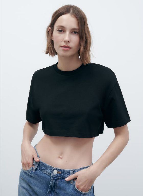 Los diseños crop también son fáciles de combinar en cuanto llegan los días de calor. En este caso, una de las camisetas de Zara que más llaman la atención es esta. Se trata de una blusa corta, disponible en el color negro intenso que nunca falla y que puedes conseguir ya en la tienda por tan solo 8,95 euros. Una gran oportunidad.