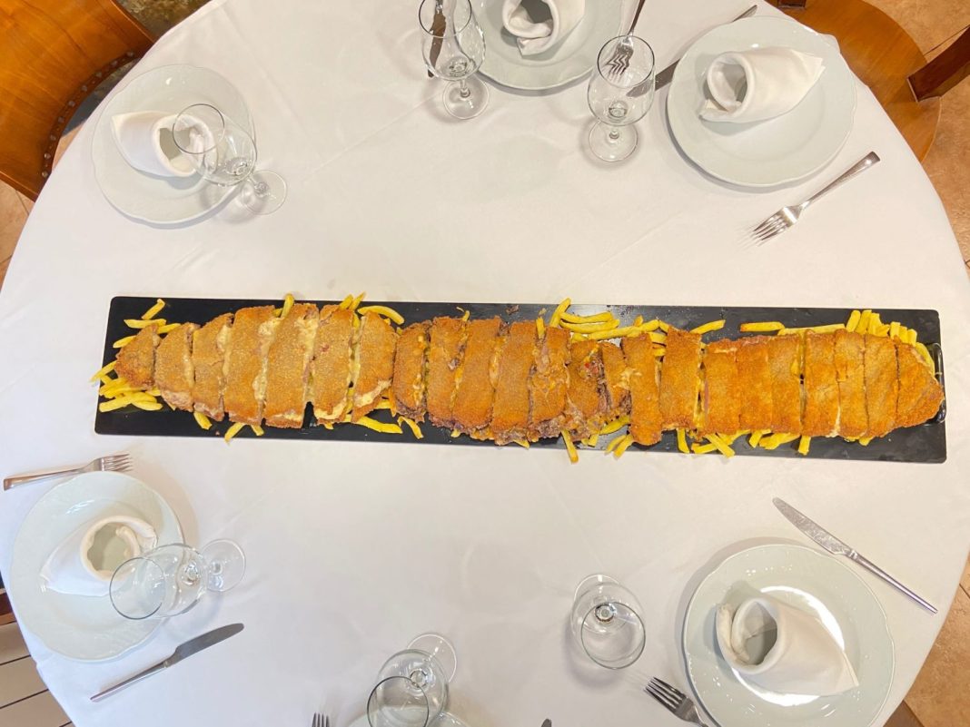 Este cachopo tan especial está pensado para compartir entre cuatro personas y tiene precio cerrado de 80 euros en el que incluye un entrante a elegir, tres botellas de sidra, cerveza o vino. Urumea se encuentra en el barrio de Chamartín en la calle de Cochamba, 7. A pesar de ser un local especializado en cahcopo también tiene otros platos en su menú como fabada, merluza a la sidra o croquetas de cabrales.