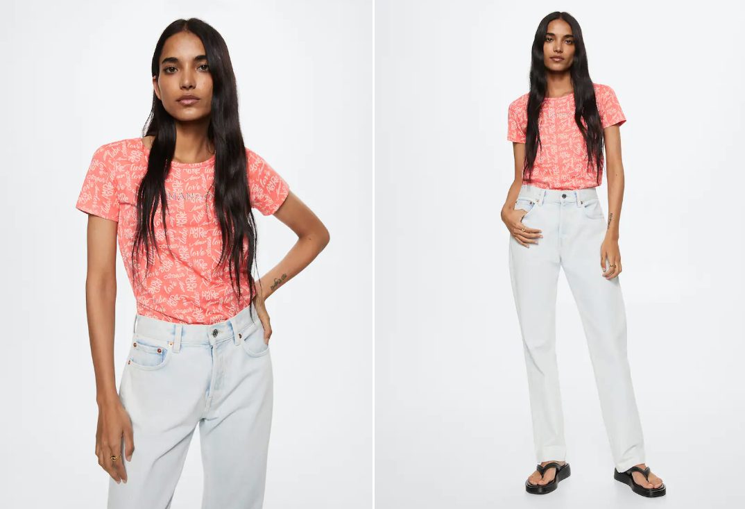 Las camisetas de manga corta también deben ser opciones básicas en tu armario en cuanto llega el buen tiempo. En este caso, una de las camisetas que más llaman la atención es esta. De diseño bordado y con estampado primaveral, también destaca gracias a su atractivo tono rosa, uno de los colores clave de la temporada. En cuanto a su precio, la tienes disponible ya en Mango por tan solo 5,99 euros cuando su precio anterior era de 7,99. Una gran oportunidad.