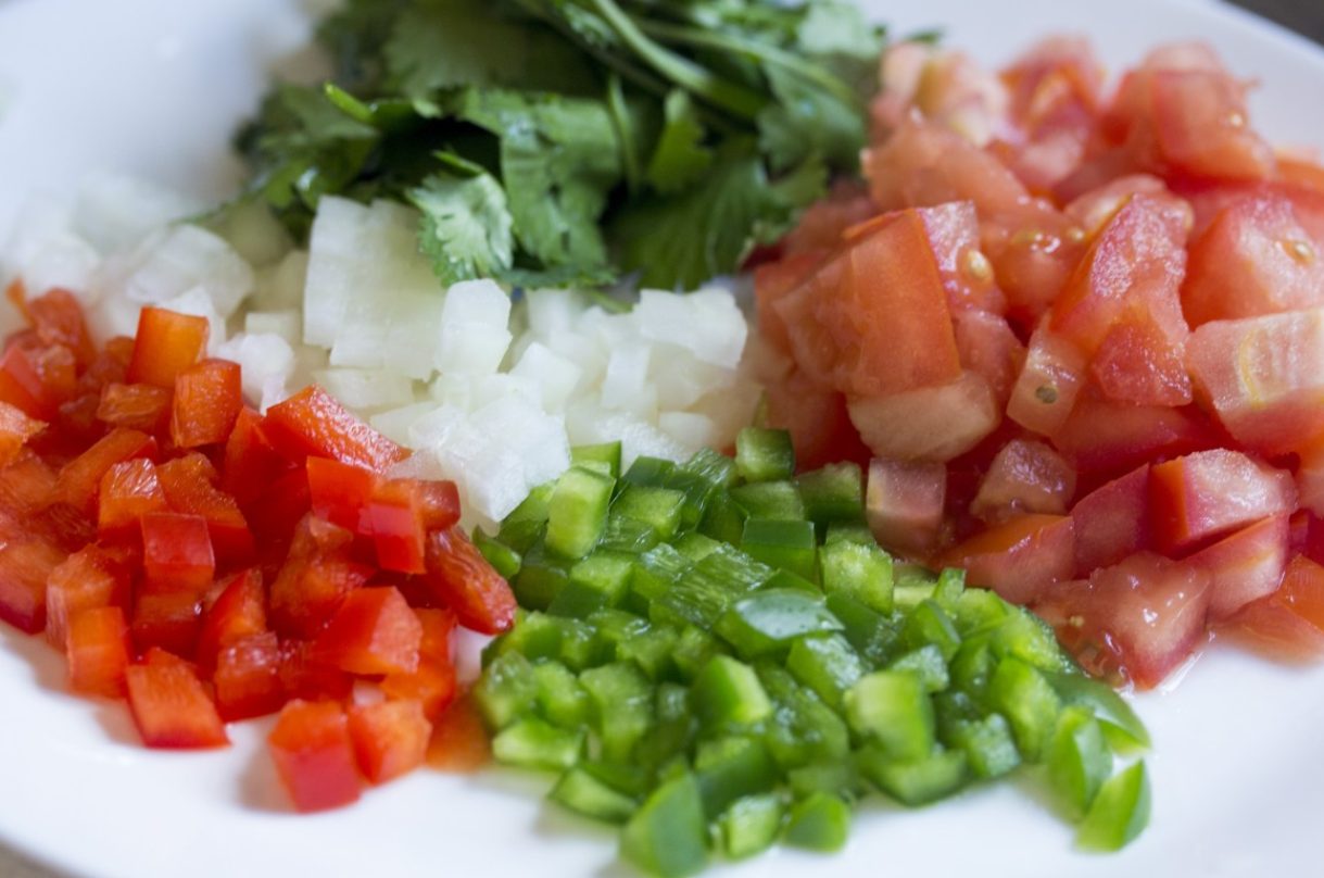 Este es uno de los momentoss clave de esta receta. Ahora toca ponerse a elaborar el exquisito relleno que completará un plato de excepción. Para ello, corta tanto la cebolla como el ajo y el puerro al estilo brunoise. Después, al estilo mirepoix, corta la berenjena, el pimiento verde y el rojo, así como la zanahoria. Mientras tanto, puedes ir rallando el tomate para usarlo más adelante.