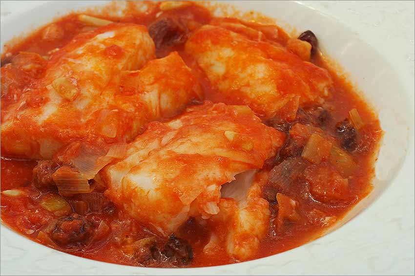 A continuación troceamos la cebolla en cubos pequeños y la sofreímos en la misma sartén donde hemos dorado el bacalao. Le damos unas vueltas y cuando esté un poco pochada y con un color transparente, agregamos el tomate troceado o triturado (al gusto), los piñones y las pasas. Revolvemos todo durante un par de minutos para que se mezclen bien los saborees y añadimos el agua. Dejamos que se cueza todo junto a fuego medio durante un par de minutos.