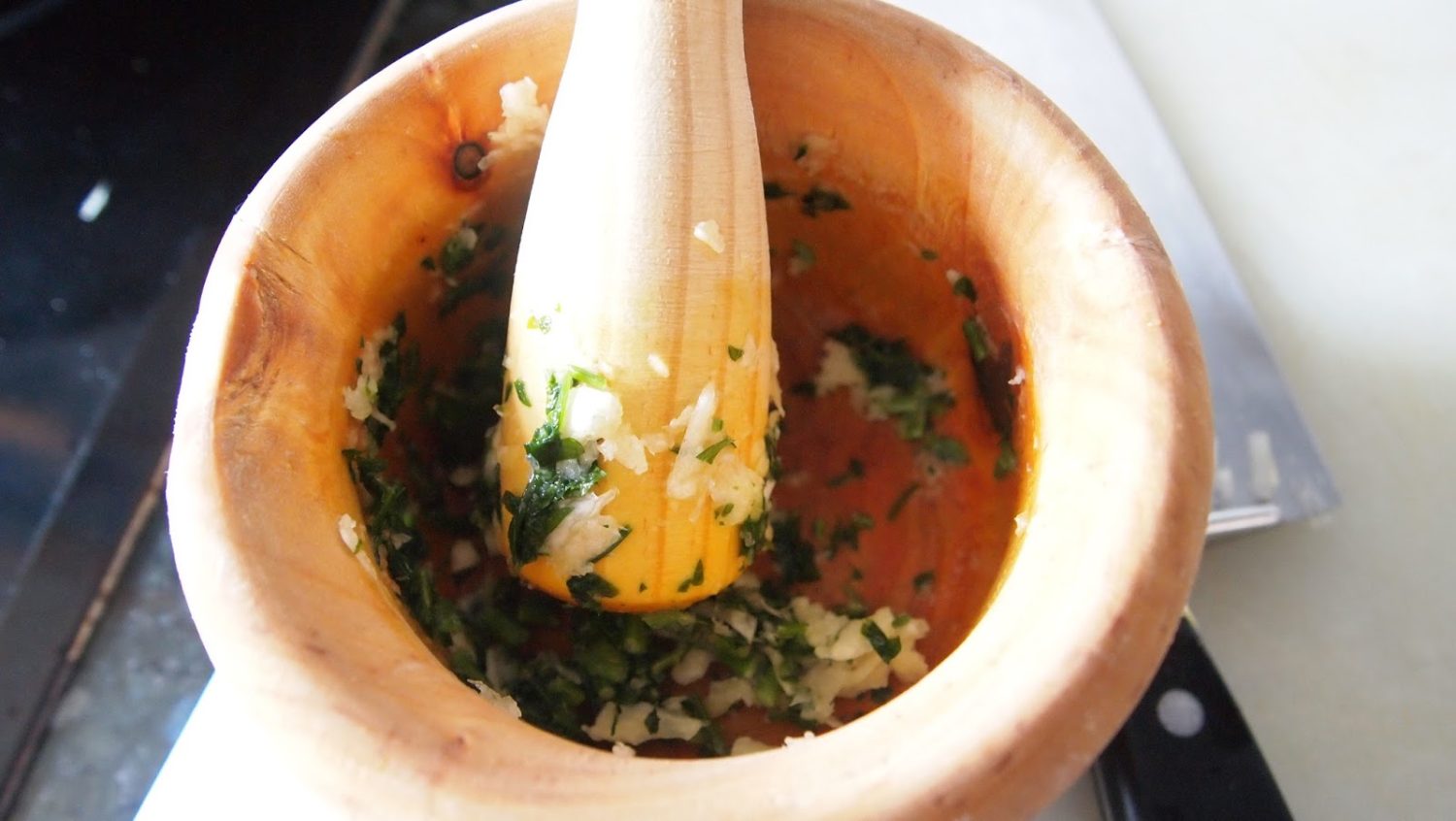 Lo siguiente es añadir el bacalao que hemos reservado. Bajamos el fuego y dejamos que se cocine todo hasta que la parte líquida se reduzca. Mientras tanto, vamos haciendo un majado con el pan que hemos frito, agregando también las almendras, los dientes de ajo y una pizca de aceite de oliva. Cuando esté todo mezclado como una pasta espesa, lo añadimos al bacalao y movemos vigorosamente la sartén para que se mezcle todo bien. Con una cuchara vamos tomando salsa y regamos el pescado para que tome más sabor. Una vez que esté el bacalao tierno, apagamos el fuego y dejamos que repose unos minutos antes de servir.