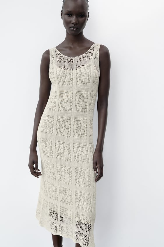 Este vestido es más informal, de inspiración bohemia, ideal para lucir en diferentes ocasiones, según como se combine. El corte es bastante sencillo, con tirantes anchos y escote redondo. Destaca por el diseño de crochet o punto abierto. Para mayor comodidad lleva un forro interior en el mismo color. Tiene un corte midi y entallado muy favorecedor. Es de algodón y poliéster de un bonito tono blanco crudo. Lo tienes en Zara por 29,95 euros.