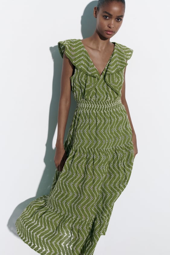 Este vestido tiene un carácter más alegre y desenfadado, muy primaveral y versátil para llevar en una ocasión especial y después seguir usándolo en el día a día. Tiene un bonito escote en forma de pico con volantes decorativos en los hombros y el pecho. Tiene manga sisa y una cintura elástica con nido de abeja, para darle un ajuste perfecto. La falda tiene un bonito vuelo fluido y la prenda lleva detalles de bordados perforados en color a contraste. Es un vestido muy suave y ligero, hecho en 100% algodón, de color verde con estampados en crudo. Lo tienes en Zara por 59,95 euros.