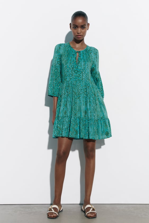 Este vestido corto es un diseño versátil, que puede funcionar en una celebración e igualmente utilizarse en el día a día. Tiene escote de pico y una elegante manga por debajo del codo. Tiene el cuello redondo con cierre con cordón y un volante en el bajo. La falda tiene mucho vuelo y movimiento gracias a la viscosa. Es de color verde intenso con detalles de hilos metalizados. Lo puedes conseguir en Zara por 29,95 euros.