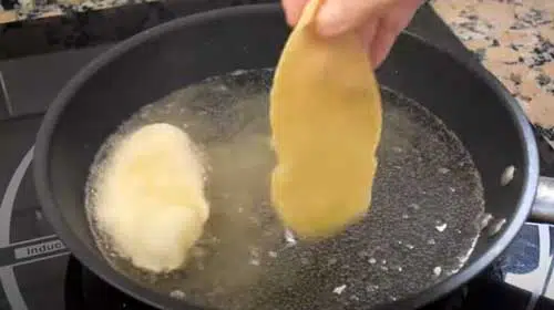 Después ponemos aceite de girasol en una sartén a fuego medio. También se puede utilizar aceite de oliva suave para que no le dé demasiado sabor en el momento de la fritura. Cuando el aceite esté bien caliente vamos añadiendo nuestros engañamaridos, de pocos a pocos, para no enfriar el aceite. Como son tan finos, se fríen en tan solo unos segundos, así que hay que estar muy pendiente. Una vez que cojan color, los vamos sacando con espumadera o pinzas, y los dejamos en una fuente cubierta de papel absorbente.