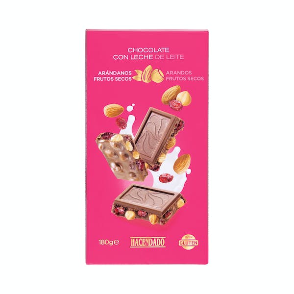 El catálogo de chocolates de Mercadona es amplísimo, y podemos encontrar de todo lo imaginable, desde bombones y chocolatinas variadas, hasta tabletas de chocolate de un montón de sabores, rellenos y texturas. A la gran selección que ya tiene ahora hay que sumarle una nueva y deliciosa variedad, que es el chocolate con leche con arándanos rojos, almendras y avellanas, una mezcla crujiente totalmente irresistible para los amantes del dulce más amado del mundo. Cada tableta tiene 180 gr y el precio es de 1,90 euros.