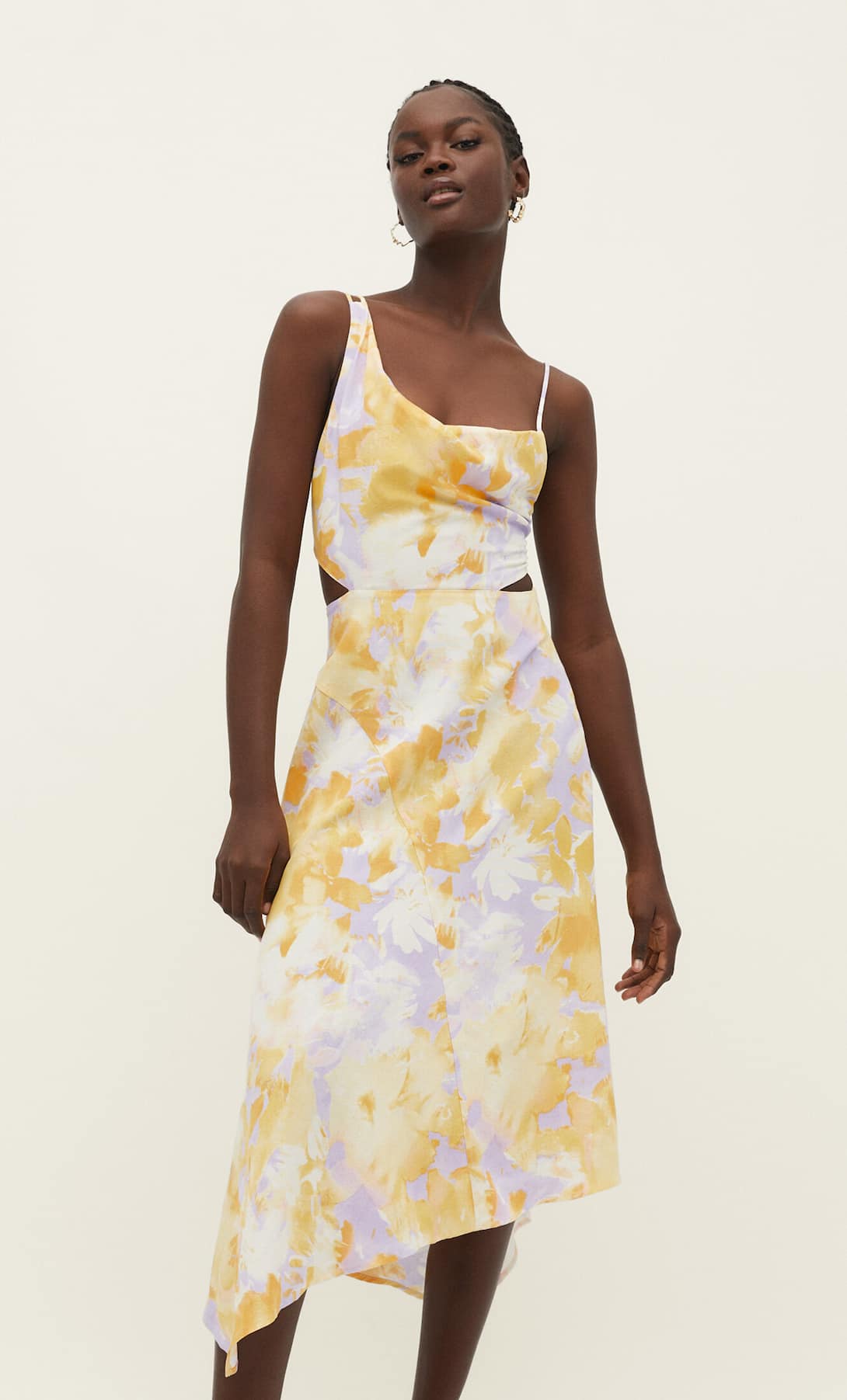 La primavera es una explosión de color. Esta es una de las razones por las que te encantará este vestido de corte midi y asimétrico de Stradivarius. Llama la atención, sobre todo, gracias a su estampado floral, que combina colores como el malva o el amarillo, propios de este temporada. Con un precio de tan solo 29,99 euros, no podrás resistirte.