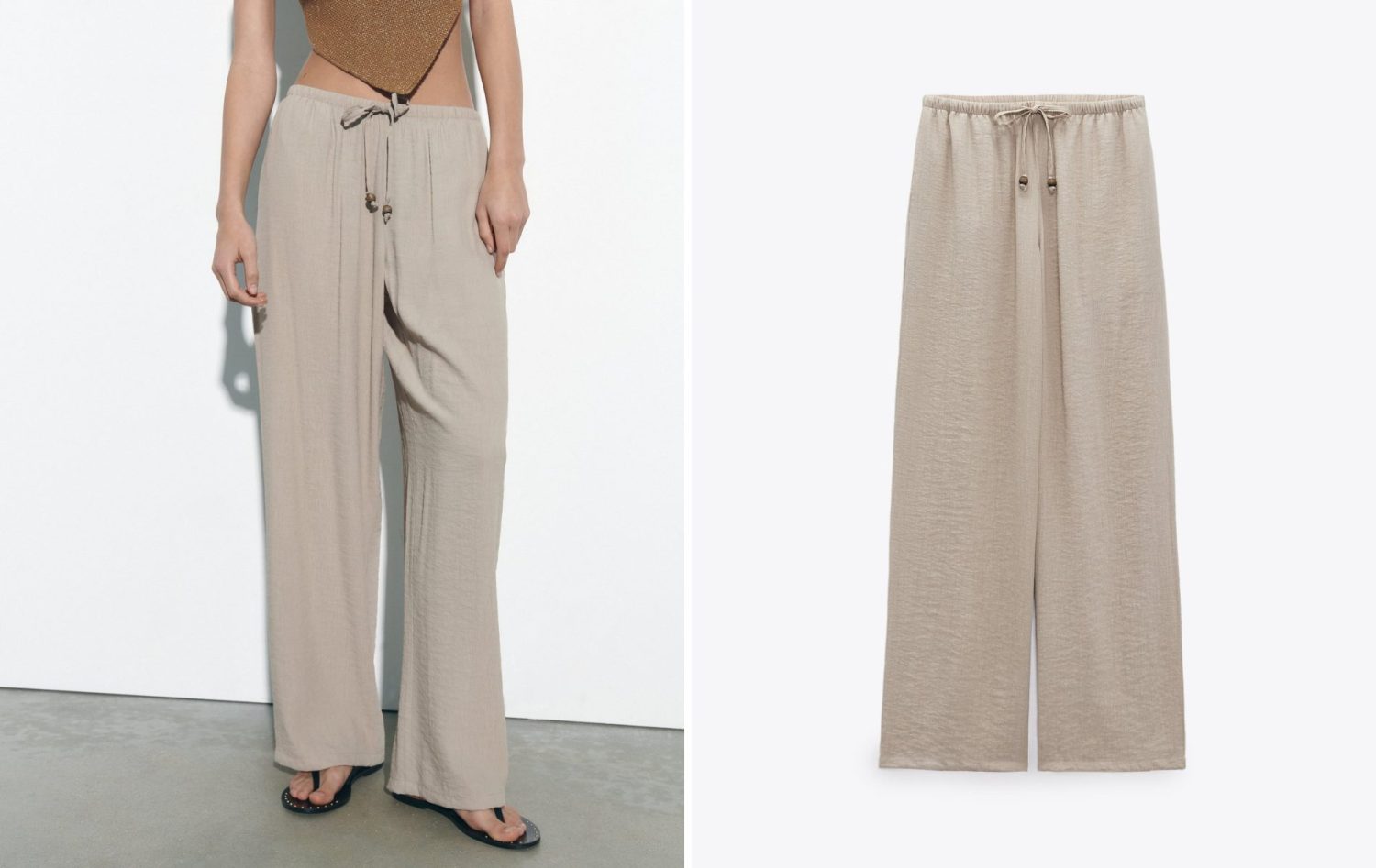 Este pantalón de Zara de tiro alto con cintura elástica y cordones es una prenda perfecta para añadir a tu armario de primavera-verano. Confeccionado en un tejido ligero y fresco, es ideal para los días cálidos y soleados.