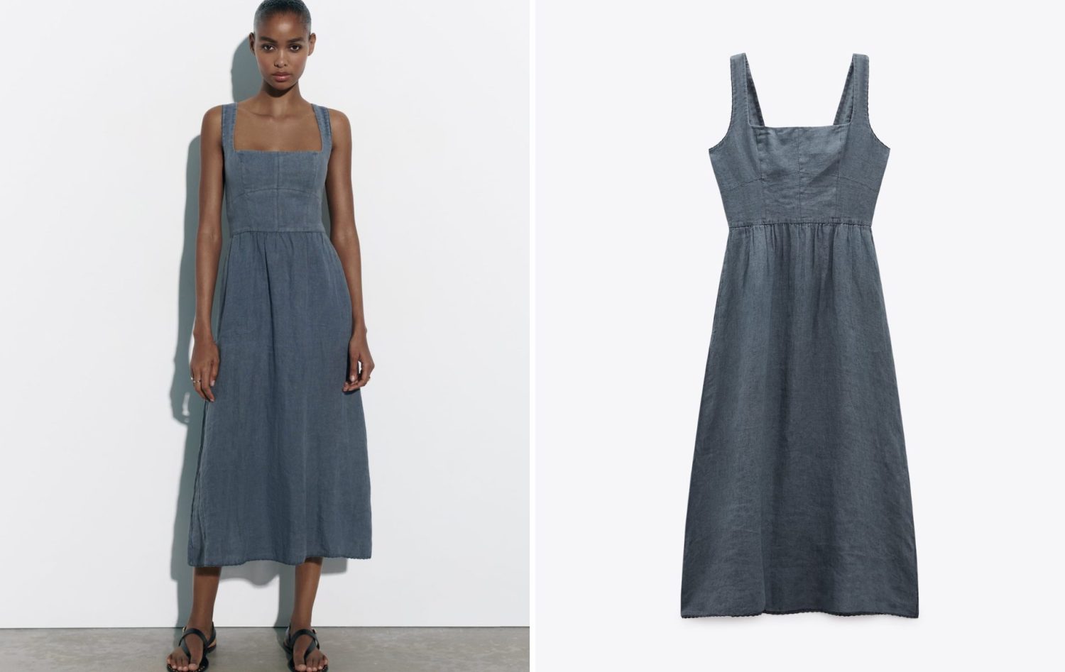 Un vestido cómodo y fresco, el vestido midi de Zara confeccionado en lino es una excelente opción para ir cómoda. Este vestido tiene un diseño sencillo pero elegante que te permitirá lucir un look casual y cosmopolita. El escote recto y los tirantes anchos le dan un toque de feminidad y elegancia al vestido, mientras que el detalle de elástico tipo nido de abeja en la parte posterior lo hace muy cómodo y fácil de ajustar a tu figura. El cierre en la espalda con cremallera metálica aporta un toque de modernidad y sofisticación al vestido.
