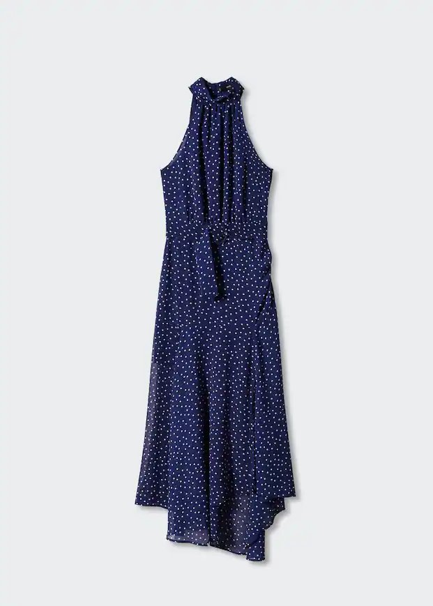 El estampado de lunares es otra tendencia que vamos a ver mucho esta temporada. Una muestra es este vestido precioso de Mango de diseño largo y un original bajo asimétrico que lo convierte en una pieza única. Está confeccionado con un tejido muy fluido y vaporoso, con un corte recto y un cuello halter abotonado en la nuca. Con los hombros al descubierto y una abertura en la espalda. Incluye un cinturón estampado que se puede desmotar y el bajo tiene dos aberturas laterales. Es un vestido de la colección de fiesta y ceremonia que tiene un recio de 59,99 euros.