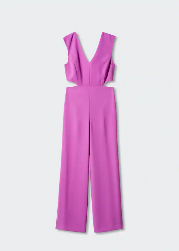 Otro de los monos que podemos encontrar en Mango es este diseño elegante y minimalista, ideal para fiestas y ceremonias. Está hecho con poliéster reciclado de botellas de plástico PET así que además es una prenda sostenible. El diseño es recto, con cuello pico y escote de pico también en la espalda. Los tirantes son anchos y cierra con cremallera en la espalda. El corte es recto, ajustado y muy favorecedor y lleva un detalle muy original de aberturas laterales en la parte de la cintura. Es de un precioso color morado y puedes llevártelo a casa por 49,99 euros.
