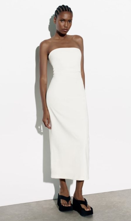 También de corte midi es este bonito y sencillo vestido ya disponible en Zara. Con diseño de tubo y escote palabra de honor, llama la atención gracias a su bonito e impoluto color blanco, que te ayudará a combinarlo con todo. Sobre su precio, te puedes hacer con él por solo 35,95 euros. No lo querrás dejar escapar.