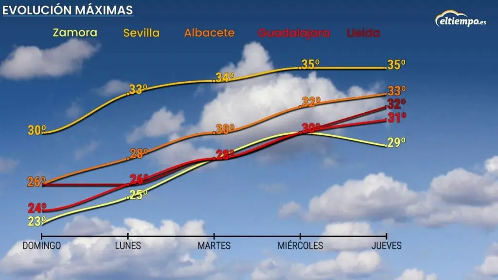 Durante el martes y el miércoles las temperaturas seguirán en aumento, alcanzado ya valores más propios del verano. En zonas del interior peninsular, como Ciudad Real, Salamanca o Cáceres, tendrán ya valores de 30 grados.