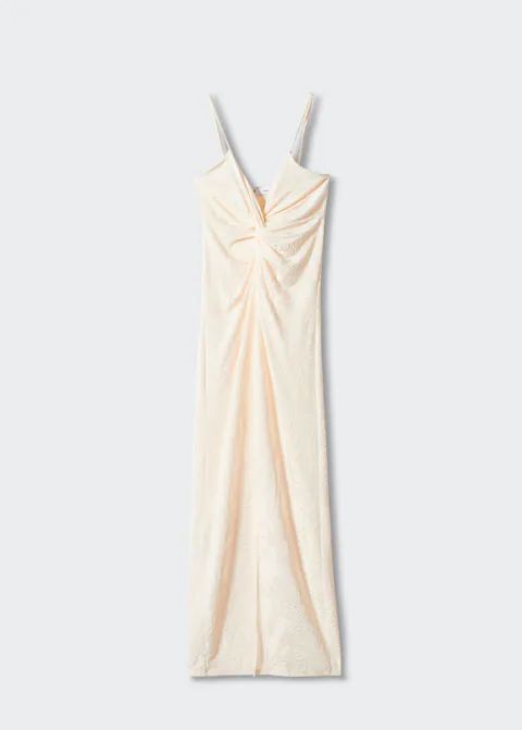 Otro vestido perfecto para eventos de primavera y verano es este diseño entallado y largo espectacular de Mango. Tiene un estilo lencero con tirantes muy finos y cuello de pico, pero el punto de sofisticación se lo da el detalle de nudo en la parte frontal con un elegante efecto drapeado. Está hecho con poliéster reciclado con un bordado de flores en el mismo tono. En la parte de delante lleva una larga abertura delantera que le da más fluidez al tejido. Es un vestido perfecto también para festivales, si lo combinas con accesorios bohemios. Está disponible en naranja tostado y crudo por un precio de 59,99 euros.