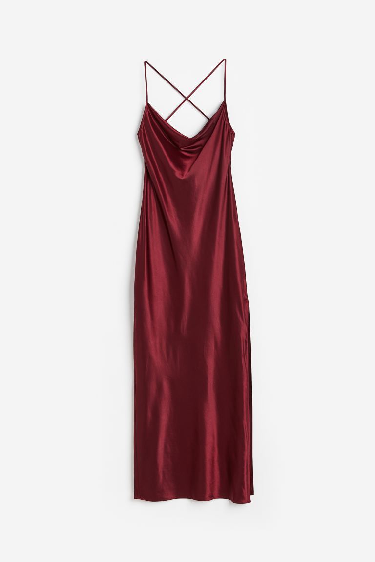 El vestido lencero es otro básico que nunca falla en eventos festivos. Este modelo largo de H&M está hecho con tejido de satén y lleva tirantes finos y un favorecedor escote drapeado. La espalda es escotada con drapeada y tirantes cruzados. El bajo del vestido es recto y lleva una pronunciada abertura en un lateral. Es una prenda ideal para celebraciones de noche, con un toque sensual y sofisticado. Hay dos colores disponibles, azul y rojo oscuro, y tiene un precio en H&M de 29,99 euros.