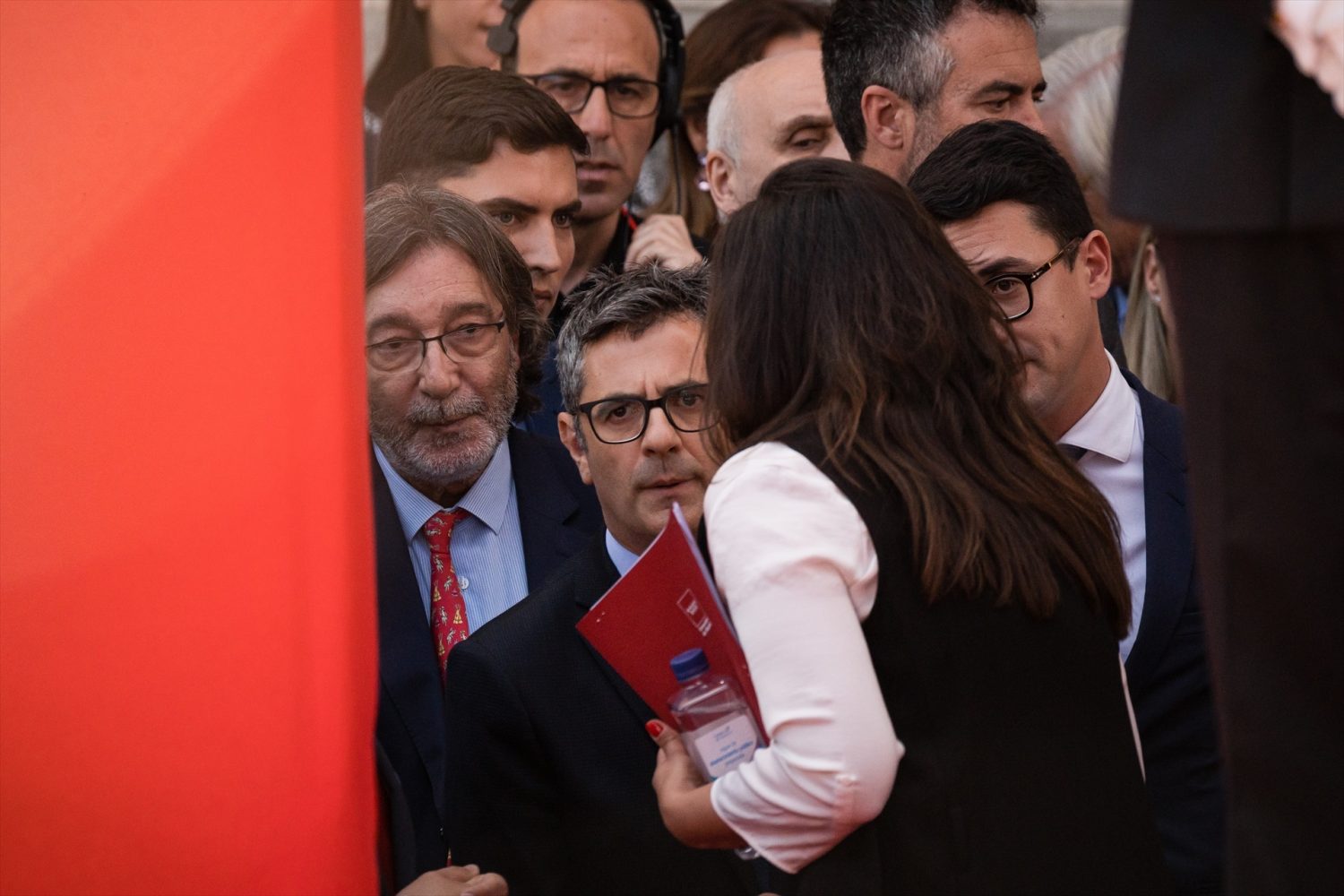 «Tenemos una organización perfectamente establecida», le espetó a Bolaños Blázquez, quien defendió de forma rígida que ya había «una ministra» y que estaban «cumpliendo toda la normativa con respecto a la representación institucional». El ministro cariacontecido, que para llegar hasta la escalera de entrada a la tribuna se saltó una valla de protocolo, tuvo que quedarse detrás a un lado de la tribuna mientras se celebraba el acto.