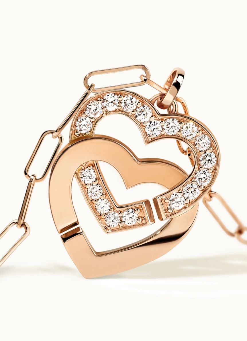 Los colgantes de la colección Double Cœurs, representados por dos corazones entrelazados con diamantes que lo hacen resplandecer con luz propia, son otros de los imprescindibles para simbolizar el amor incondicional de una madre. En sus versiones de oro blanco, oro amarillo u oro rosa con diamantes, y en tamaño XL, serán objeto de deseo de toda mujer.