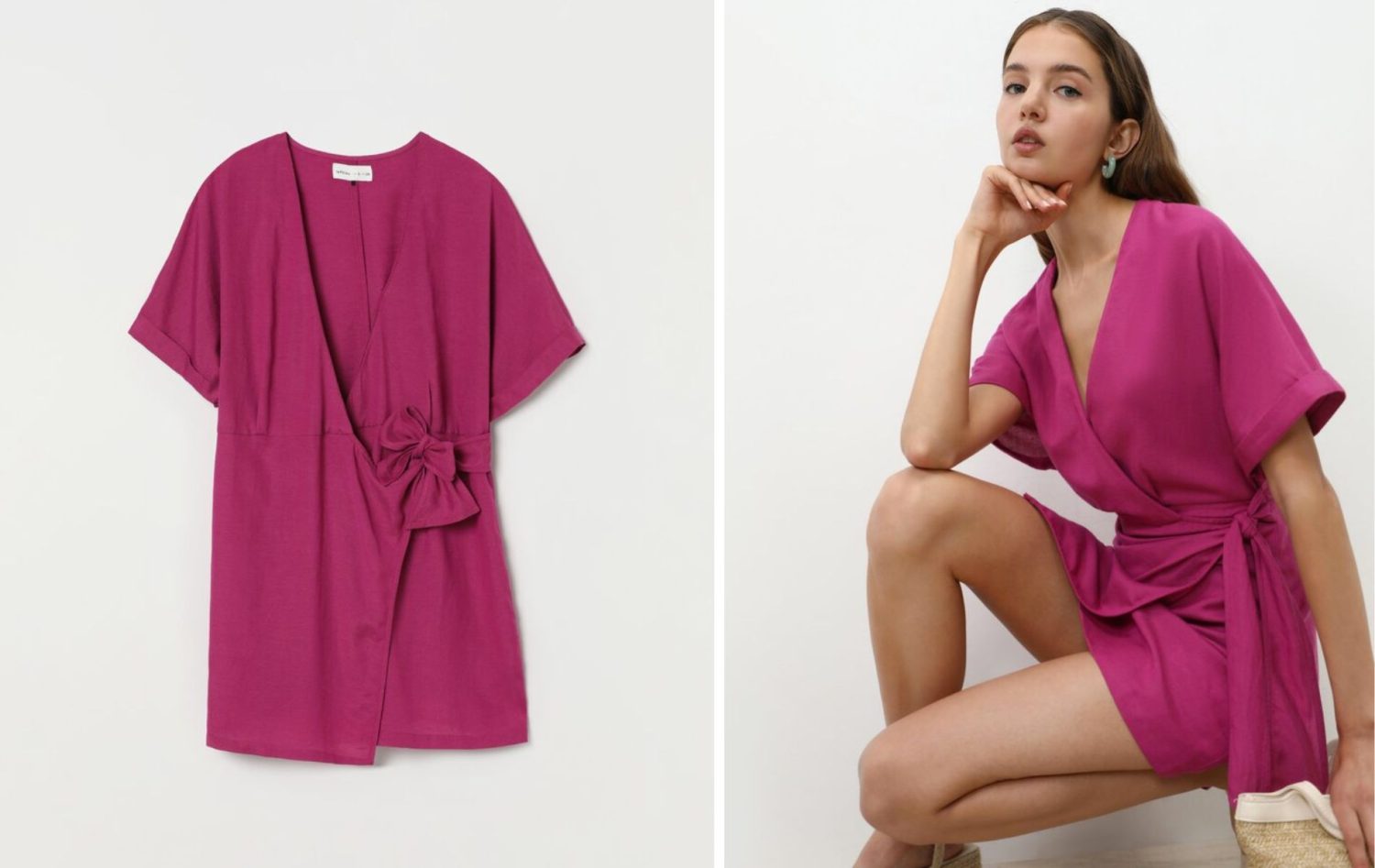 ¡El vestido corto cruzado color fucsia de Lefties es una prenda que también puede lucirse en la oficina con mucho estilo! El color fucsia brillante añade un toque de alegría y energía a la rutina laboral, sin dejar de lado la formalidad que requiere un entorno laboral.