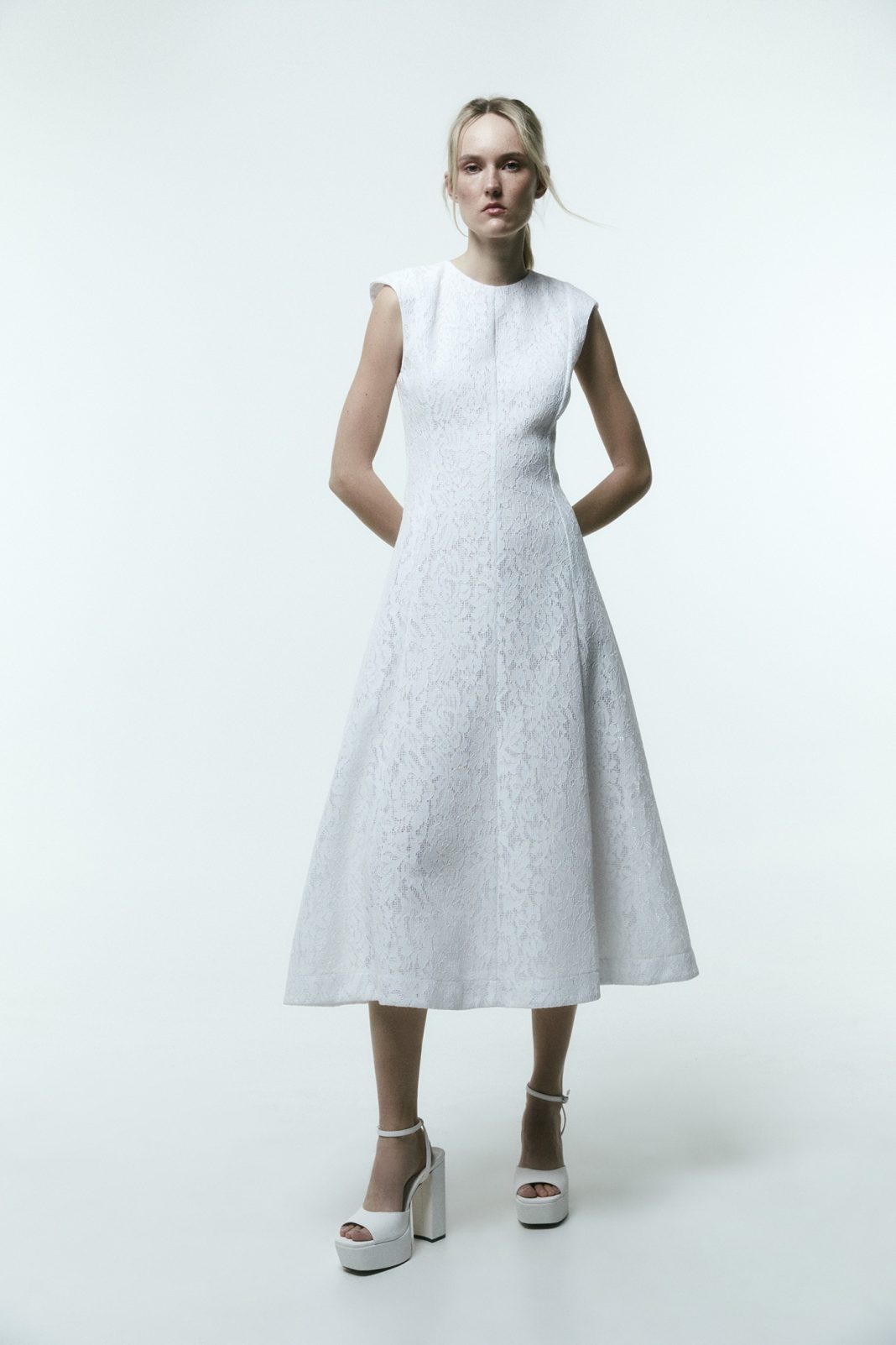 Lamentablemente, el vestido ya no está disponible porque, como decíamos, es de la temporada anterior. Sin embargo, en Sfera podemos encontrar otro modelo de encaje bastante similar y que perfectamente podría formar parte del guardarropa de doña Letizia. Se trata de un diseño midi con cuello caja, cintura entallada y falda con vuelo. Es de encaje, con forro interior, sin mangas, y con un cierre en la espalda oculto en la costura. También es de color blanco y es perfecto para lucir en ocasiones especiales que requieran un look elegante y sofisticado. Lo tienes a un precio de 49,99 euros.