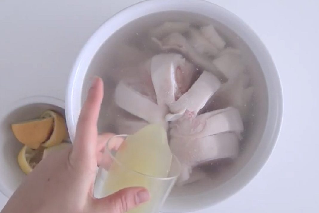 Cogemos una cazuela grande u express directamente para ir más rápido. Ponemos a cocer el estómago troceado en agua fría, ponemos los 2 dientes de ajo, hojas de laurel, pimientas en grano, pata de ternera, jamón, uña y codillo de cerdo, entre 5 y 6 minutos. Escurrimos y reservamos la pata de ternera, uña y codillo de cerdo.
