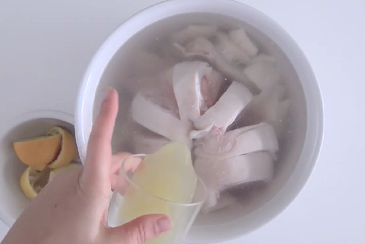 Cuando ya hemos preparando los ingredientes, empezamos los callos a la madrileña lavando bien el estómago y la pata de ternera, sobre todo en la zona del estómago, dedicando mucho esmero a esta parte de la elaboración. Cortamos en trozos pequeños el estómago cuando ya está 100% limpio.