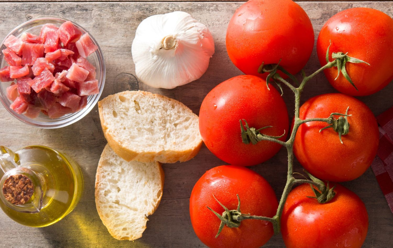 1 kg de tomates de pera maduros, 150 g de miga de pan blanco, 1 diente de ajo, Sal al gusto, 100 ml de aceite de oliva suave, 2 huevos y 50 g de jamón ibérico.