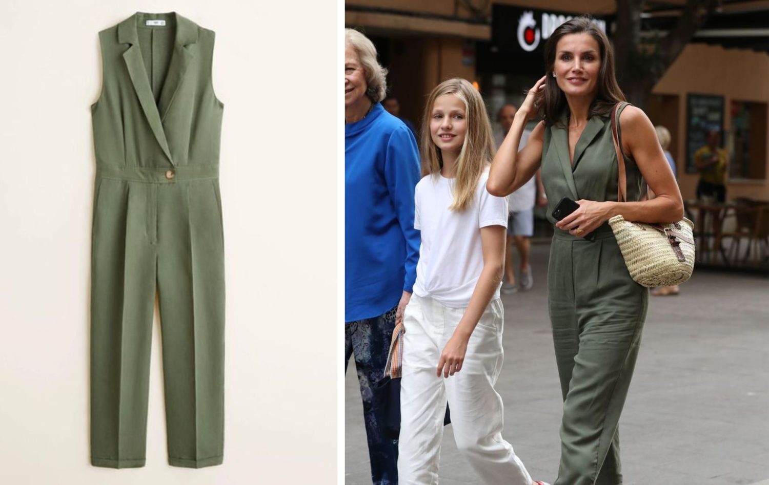 El mono de lino en color khaki de Mango que la Reina Letizia lució durante sus vacaciones en Mallorca es una prenda muy versátil y cómoda, ideal para eventos informales o de verano. El escote en pico y la falta de mangas le dan un toque fresco y desenfadado, mientras que el color khaki es muy fácil de combinar. La elección de las alpargatas de piel y el bolso capacho completan un look muy acertado para un día de vacaciones. El precio del mono es de 49,99 € y está disponible en todas las tallas desde la S hasta la L.