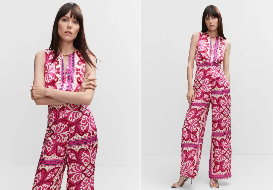 Si eres una de esas personas a las que les gusta ir siempre bien vestidas, pero no deseas adquirir una gran cantiad de prendas para conseguirlo, este mono de Mango también será tu opción ideal. Disponible con motivos en fucsia, destaca tanto por su estampado como por su aplique metálico, que le da un aire aún más elegante. En cuanto a su precio, lo tienes disponible por solo 49,99 euros.