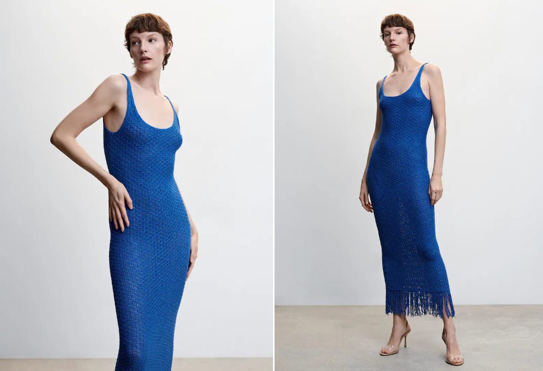 Otro vestido de punto que no puedes dejar pasar si eres amante de las prendas frescas que triunfan durante el verano es este. Disponible en un bonito y llamativo color azul, otro de los detalles que hacen que conquiste todas las miradass es su bajo de flecos. En cuanto a su precio, puede ser tuyo por tan solo 39,99 euros.