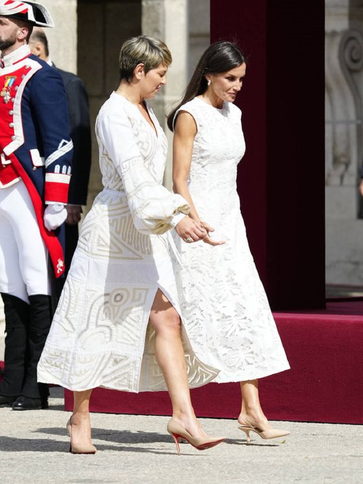 En el caso de la reina de España, llevó un diseño de encaje de Sfera, disponible en El Corte Inglés y unos slingback de Magrit, un bolso de flores de Furla y pendientes de la firma colombiana Bibi Marini, como guiño a los dirigentes que visitaban nuestro país. Verónica Alcocer también llevó un diseño blanco, con detalles artesanales en crudo, hechos por Diana Chirimía, que pertenece a la tribu embara katío. Al igual que la experiodista lució su estilismo con salones nude de Louboutin.