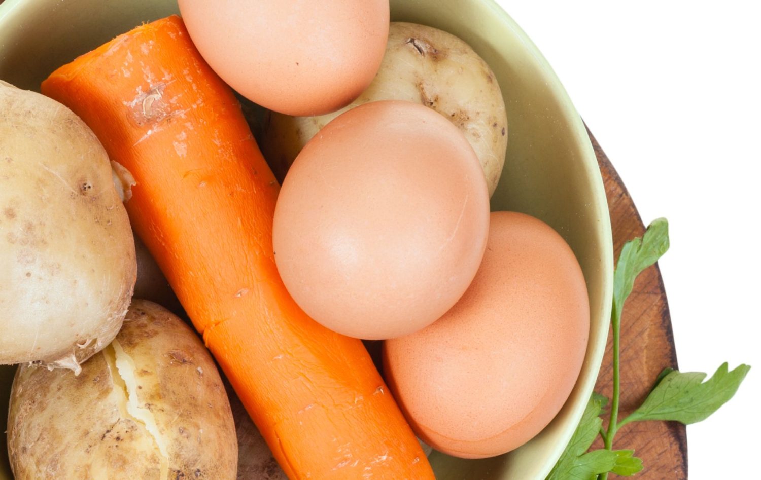 En una cacerola con agua abundante, cocemos las patatas y las zanahorias sin pelar a fuego suave hasta que estén al dente. Mientras tanto, cocemos tres huevos en agua con sal y un chorrito de vinagre, los pelamos y picamos finamente.