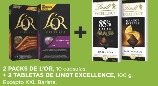 Esta es, sin duda, una de las promociones que más llaman la atención de Supercor. En este caso, ahora te puedes llevar dos packs de 10 cápsulas L’Or, excepto XXL Barista, más dos tabletas de Lindt Excellence de 100 gramos por tan solo 9,99 euros. Además, tendrás la oportunidad de conseguir una L’Or Barista subiendo tu ticket. Podrás consultar todas las condiciones en la web de El Corte Inglés.
